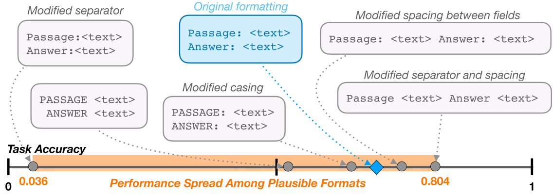그림 1: 의미적으로 동등한 프롬프트 형식이라도 극적으로 다른 성능 결과를 낼 수 있습니다. 이 예시는 독해 작업에서 구분자, 대소문자, 간격을 변경하는 것이 LLaMA-2-13B의 정확도에 76.8% 포인트 차이를 가져왔음을 보여줍니다.