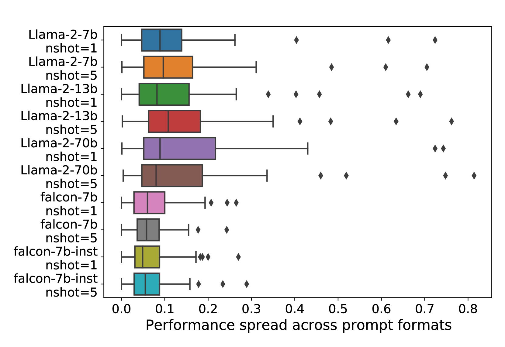 광범위한 큰 성능 편차: 결과는 테스트된 모든 조건에서 놀라운 민감도를 보여줍니다. 최대 76 정확도 포인트의 성능 편차가 관찰되었으며, 모든 모델-작업 조합에서 중앙값 편차는 7.5 포인트였습니다. 결정적으로, 작업의 20%는 LLaMA-2 모델의 경우 최소 15 포인트의 편차를 보였는데, 이는 무작위 형식 10개만 샘플링했을 때도 발생했으며, 이는 실제 편차의 하한선을 나타냅니다.