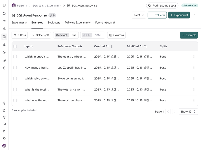 client.create_examples(inputs=inputs, outputs=outputs, dataset_id=dataset.id)위 코드를 실행하면 랭스미스에 /“Datasets & Experiments”에 아래와 같이 SQL Agent Response 가 새로 생성된 것을 확인할 수 있다.